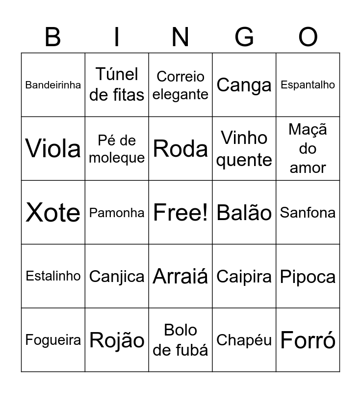 This bingo card has a free space and 29 words: Fogueira, Quadrilha, Pamonha, Milho, Bandeirinha, Correio elegante, Pé de moleque, Canjica, Balão, Rojão, Sanfona, Forró, Bolo de fubá, Chapéu, Maçã do amor, Quentão, Arraiá, Estalinho, Espantalho, Xote, Caipira, Paçoca, Vinho quente, Viola, Canga, Túnel de fitas, Pipoca, Roda and Dança da laranja.