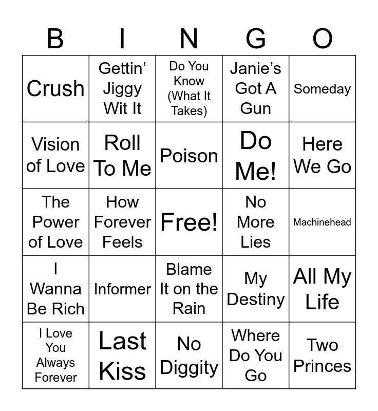 This bingo card has a free space and 45 words: Wonder, Two Princes, Badlands, I Love You Always Forever, If It Makes You Happy, Where Do You Go, Do You Know (What It Takes), Rock This Country!, Someday, Last Kiss, Janie’s Got A Gun, No More Lies, Blame It on the Rain, Informer, Rub You The Right Way, No Diggity, This Is How We Do It, The Power of Love, We’ve Got It Goin’ On, Here We Go, Gettin’ Jiggy Wit It, Smooth, Iris, Crush, Sunny Came Home, Machinehead, Fell On Black Days, Who Do You Love, My Destiny, I Wanna Be Rich, Unbelievable, All My Life, Ironic, Be My Lover, Love Will Never Do (Without You), How Forever Feels, Back To Life, Two To Make It Right, Hold On, Poison, Vision of Love, Do Me!, She Ain’t Worth It, Roll To Me and Tubthumping.