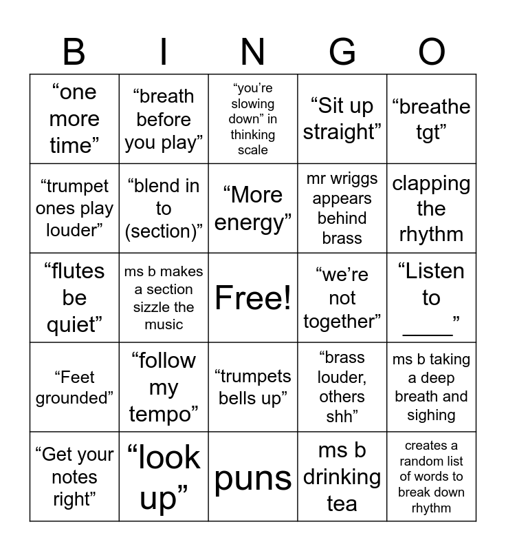 This bingo card has a free space and 24 words: “follow my tempo”, “look up”, “More energy”, “Get your notes right”, “breathe tgt”, “one more time”, “trumpet ones play louder”, “breath before you play”, “we’re not together”, “trumpets bells up”, mr wriggs appears behind brass, “flutes be quiet”, “brass louder, others shh”, ms b taking a deep breath and sighing, “blend in to (section)”, ms b drinking tea, “Listen to ____”, “you’re slowing down” in thinking scale, clapping the rhythm, ms b makes a section sizzle the music, creates a random list of words to break down rhythm, “Feet grounded”, “Sit up straight” and puns.