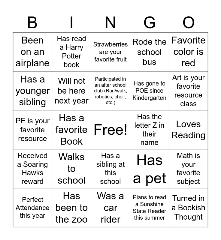 This bingo card has a free space and 39 words: Going on a summer trip, Has a birthday in June or July, Can name the Principal and Assistant Principals, Will not be here next year, Perfect Attendance this year, Has a sibling at this school, Participated in an after school club (Run/walk, robotics, choir, etc.), Brought lunch to school, Favorite color is red, Received a Soaring Hawks reward, Has a favorite Book, Rode the school bus, Turned in a Bookish Thought, Loves Reading, Has the letter Z in their name, Walks to school, Is left handed, Been on an airplane, Read a sunshine state reader this year, Has a pet, Has a younger sibling, Was a car rider, Has gone to POE since Kindergarten, Art is your favorite resource class, Favorite color is purple, Can name the state Capitol of Florida, Music is your favorite resource, Plays a sport/ dances/ cheerlead/ outside of school, Likes the dog man books, Has read a Harry Potter book, Has a family member in the military, Cheese is your favorite type of pizza, Strawberries are your favorite fruit, Has been to the zoo, Plans to read a Sunshine State Reader this summer, Likes chocolate better than sour candy, Math is your favorite subject, PE is your favorite resource and You have been to a live play or musical.
