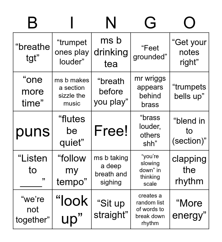 This bingo card has a free space and 24 words: “follow my tempo”, “look up”, “breath before you play”, “we’re not together”, “Get your notes right”, “breathe tgt”, “one more time”, “trumpet ones play louder”, “brass louder, others shh”, ms b taking a deep breath and sighing, mr wriggs appears behind brass, puns, “you’re slowing down” in thinking scale, clapping the rhythm, ms b makes a section sizzle the music, creates a random list of words to break down rhythm, “blend in to (section)”, ms b drinking tea, “trumpets bells up”, “flutes be quiet”, “More energy”, “Listen to ____”, “Feet grounded” and “Sit up straight”.