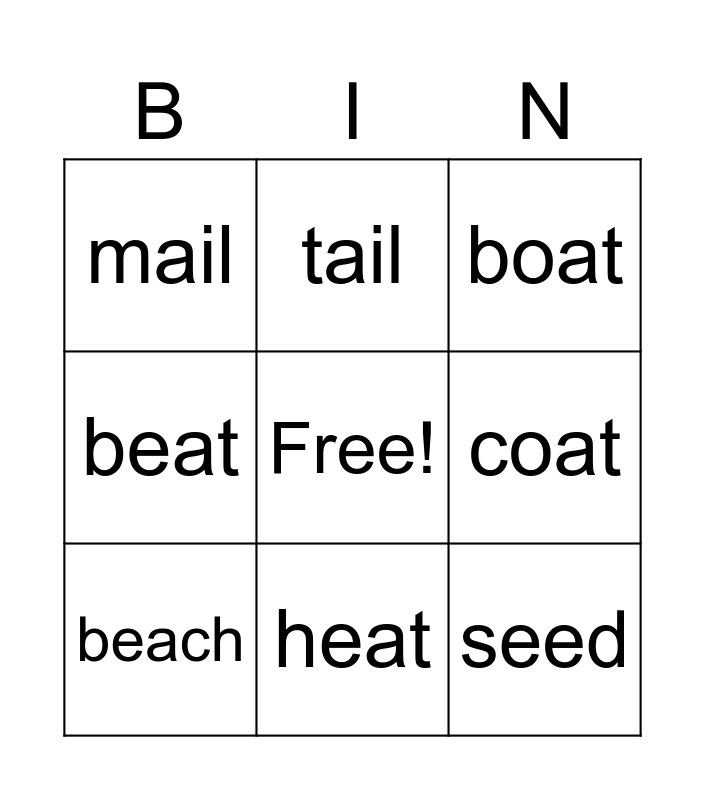 This bingo card has a free space and 8 words: coat, boat, tail, beach, mail, seed, beat and heat.