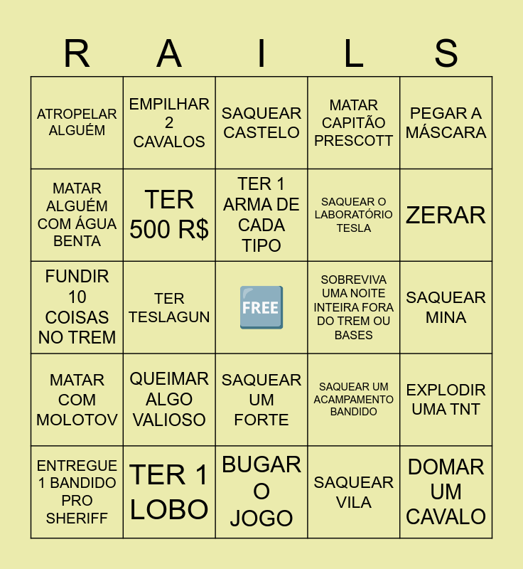This bingo card has a free space and 24 words: QUEIMAR ALGO VALIOSO, TER 1 LOBO, TER 1 ARMA DE CADA TIPO, ENTREGUE 1 BANDIDO PRO SHERIFF, PEGAR A MÁSCARA, ATROPELAR ALGUÉM, MATAR ALGUÉM COM ÁGUA BENTA, EMPILHAR 2 CAVALOS, SOBREVIVA UMA NOITE INTEIRA FORA DO TREM OU BASES, SAQUEAR UM FORTE, SAQUEAR O LABORATÓRIO TESLA, FUNDIR 10 COISAS NO TREM, SAQUEAR UM ACAMPAMENTO BANDIDO, EXPLODIR UMA TNT, TER 500 R$, SAQUEAR VILA, SAQUEAR MINA, SAQUEAR CASTELO, ZERAR, TER TESLAGUN, DOMAR UM CAVALO, MATAR COM MOLOTOV, MATAR CAPITÃO PRESCOTT and BUGAR O JOGO.