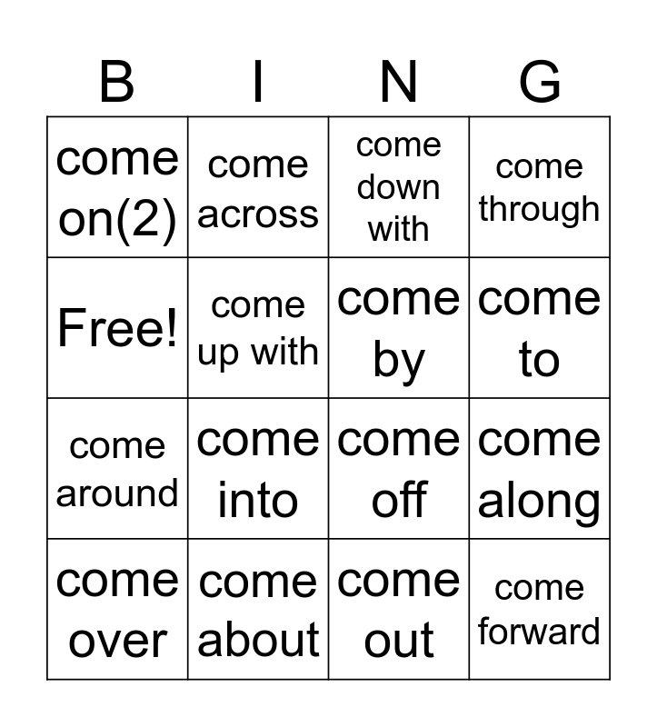 This bingo card has 16 words: come about, come along, come down with, come on(2), come around, come across, come off, come out, Free!, come up with, come over, come through, come into, come to, come by and come forward.
