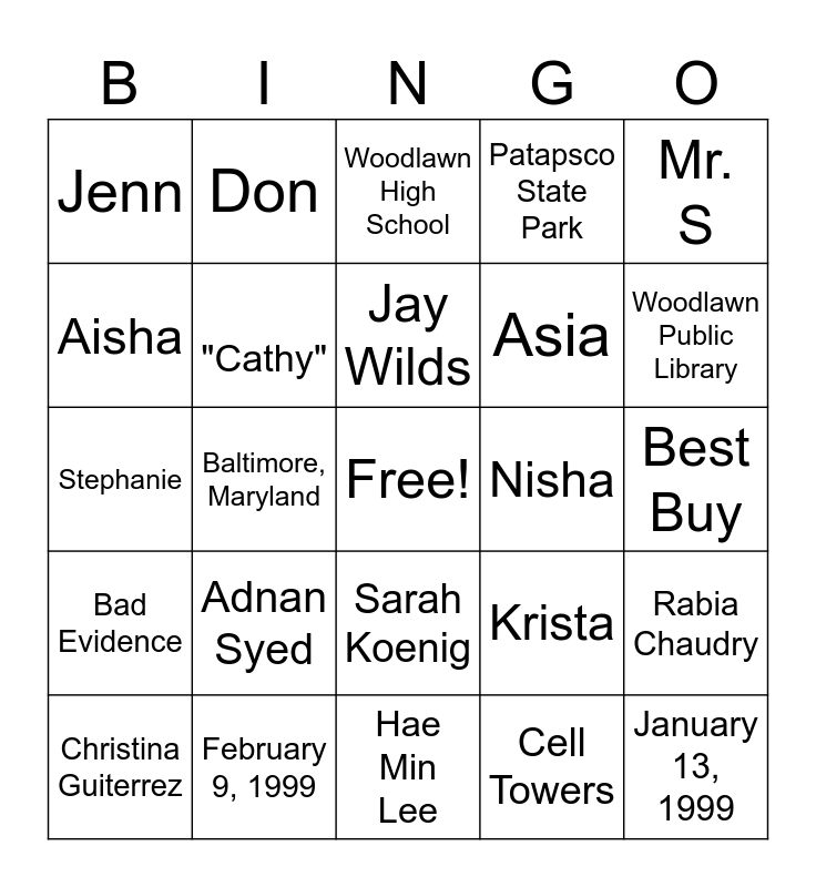 This bingo card has a free space and 25 words: Adnan Syed, Hae Min Lee, Jay Wilds, Christina Guiterrez, Mr. S, Jenn, Aisha, Don, Nisha, Sarah Koenig, Asia, Stephanie, Krista, Rabia Chaudry, "Cathy", Leakin Park, Best Buy, Woodlawn High School, Woodlawn Public Library, Baltimore, Maryland, January 13, 1999, February 9, 1999, Bad Evidence, Patapsco State Park and Cell Towers.