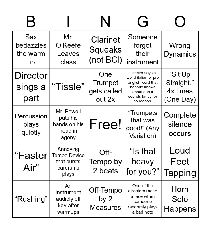 This bingo card has a free space and 33 words: Multiple tumpets get called out, “Dragging”, Mr. Powell puts his hands on his head in agony, “Bop It”, “Faster Air”, “Tissle”, Wrong Dynamics, “Rushing”, Mr. O’Keefe Leaves class, Percussion plays late, One Trumpet gets called out 2x, Clarinet Squeaks (not BCl), Director yells “…Key Signature”, Someone plays after the cutoff because they weren’t listening (Cannot be yourself or trumpets), “Trumpets that was good!” (Any Variation), “Sit Up Straight.” 4x times (One Day), An instrument audibly off key after warmups, Percussion plays quietly, Annoying Tempo Device that bursts eardrums plays, “Is that heavy for you?”, Off-Tempo by 2 beats, Percussion sits down, Sax bedazzles the warm up, Complete silence occurs, Off-Tempo by 2 Measures, Horn Solo Happens, Someone forgot their instrument, Director says a weird italian or pre english word that nobody knows about and it sounds fancy for no reason., Director sings a part, Loud Feet Tapping, Someone forgot their book/music, One of the directors make a face when someone randomly plays a bad note and Trumpets too loud.