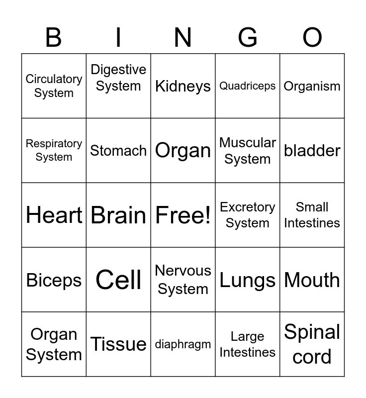 This bingo card has a free space and 24 words: Cell, Tissue, Organ, Organ System, Organism, Circulatory System, Respiratory System, Digestive System, Excretory System, Nervous System, Muscular System, Heart, Lungs, Mouth, Stomach, Large Intestines, Small Intestines, Kidneys, bladder, Brain, Spinal cord, Biceps, Quadriceps and diaphragm.