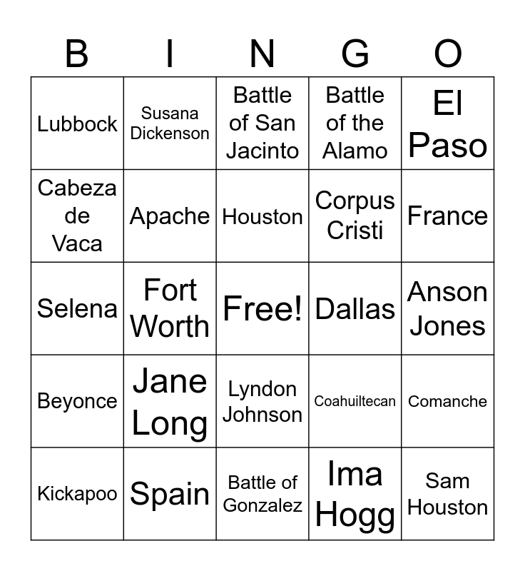 This bingo card has a free space and 53 words: Stephen F. Austin, Sam Houston, Dwight D. Eisenhower, Ima Hogg, Jane Long, Angelina Eberly, Susana Dickenson, Alonso de Pineda, Cabeza de Vaca, Caddo, Apache, Kiowa, Comanche, Coahuiltecan, Karankawa, Kickapoo, Houston, Dallas, San Antonio, El Paso, Fort Worth, Austin, Corpus Cristi, Lubbock, Amarillo, Spain, Mexico, Republic of Texas, United States, France, Confederate States, Missions, Texas Revolution, Civil War, Cattle, Spindletop - Oil Boom, Battle of the Alamo, Battle of Gonzalez, Battle of San Jacinto, Old 300, Santa Anna, Mirabeau Lamar, Anson Jones, James Pinckney Henderson, Annexation (28), Lyndon Johnson, Galveston Hurricane, Scott Joplin, Selena, Beyonce, Simone Biles, George Foreman and Earl Campbell.
