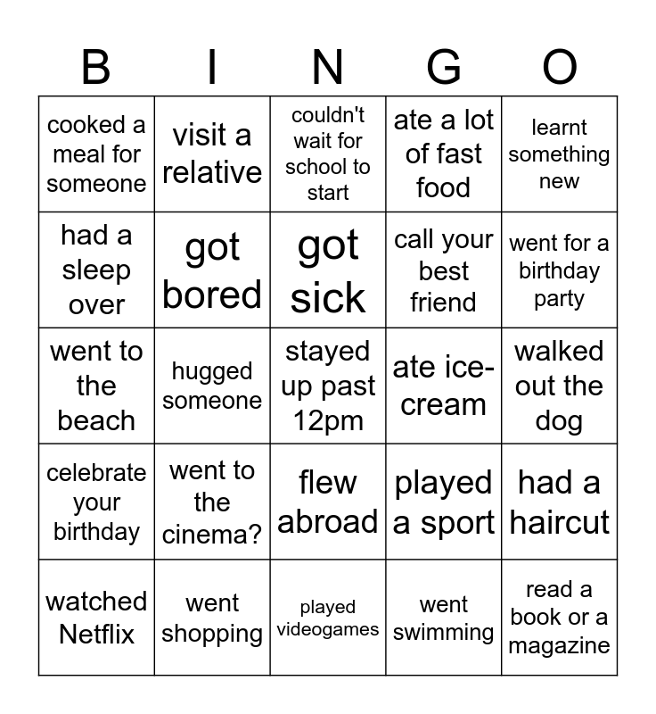 This bingo card has a free space and 24 words: went to the cinema?, went shopping, got sick, watched Netflix, learnt something new, cooked a meal for someone, had a sleep over, visit a relative, ate ice-cream, flew abroad, call your best friend, went to the beach, played a sport, had a haircut, got bored, went swimming, walked out the dog, couldn't wait for school to start, went for a birthday party, hugged someone, read a book or a magazine, celebrate your birthday, ate a lot of fast food and played videogames.