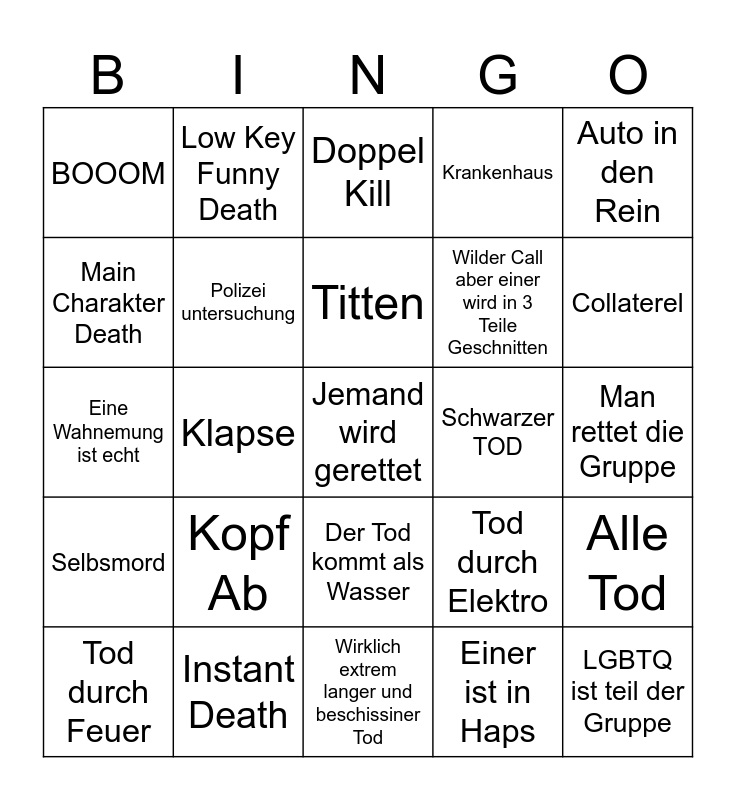 This bingo card has a free space and 24 words: Kopf Ab, Instant Death, Titten, Tod durch Feuer, Auto in den Rein, BOOOM, Main Charakter Death, Low Key Funny Death, Schwarzer TOD, Der Tod kommt als Wasser, Wilder Call aber einer wird in 3 Teile Geschnitten, Eine Wahnemung ist echt, Tod durch Elektro, Alle Tod, Polizei untersuchung, Einer ist in Haps, Man rettet die Gruppe, Doppel Kill, Collaterel, Klapse, LGBTQ ist teil der Gruppe, Selbsmord, Krankenhaus and Wirklich extrem langer und beschissiner Tod.