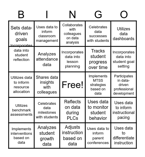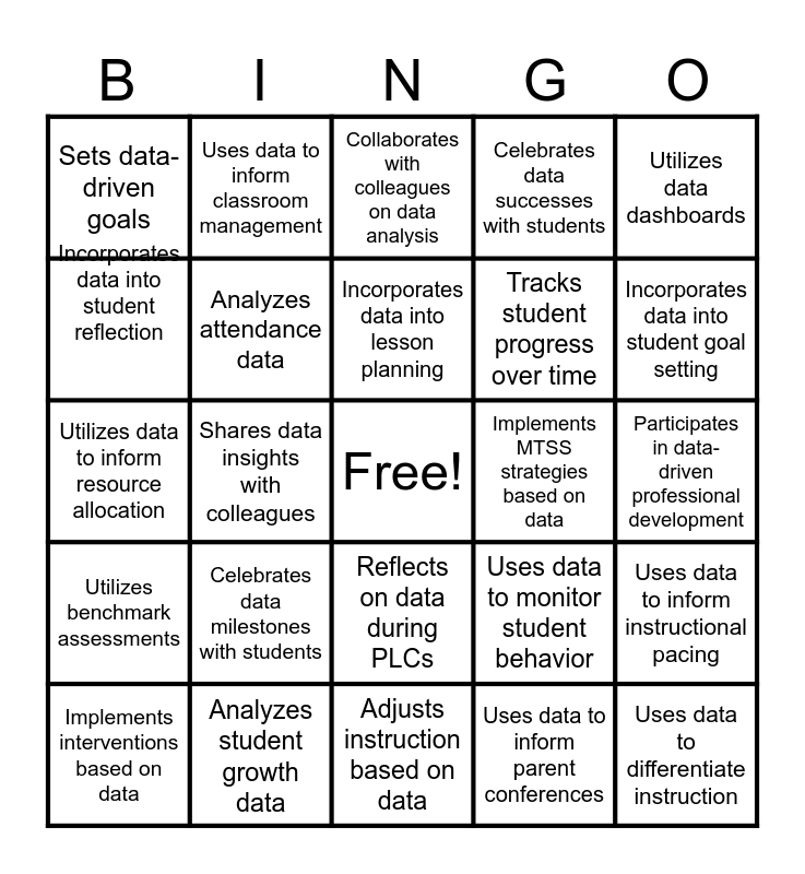 This bingo card has a free space and 31 words: Uses formative assessments, Analyzes student growth data, Incorporates data into lesson planning, Participates in data team meetings, Utilizes data dashboards, Sets data-driven goals, Shares data insights with colleagues, Adjusts instruction based on data, Tracks student progress over time, Uses data to differentiate instruction, Implements interventions based on data, Celebrates data milestones with students, Uses data to inform parent conferences, Incorporates student voice in data discussions, Utilizes benchmark assessments, Analyzes standardized test results, Reflects on data during PLCs, Implements MTSS strategies based on data, Participates in data-driven professional development, Shares best practices from data analysis, Uses data to inform classroom management, Uses data to identify learning gaps, Uses data to monitor student behavior, Incorporates data into student goal setting, Utilizes data to inform resource allocation, Analyzes attendance data, Collaborates with colleagues on data analysis, Celebrates data successes with students, Uses data to inform instructional pacing, Incorporates data into student reflection and Uses data to inform curriculum adjustments.