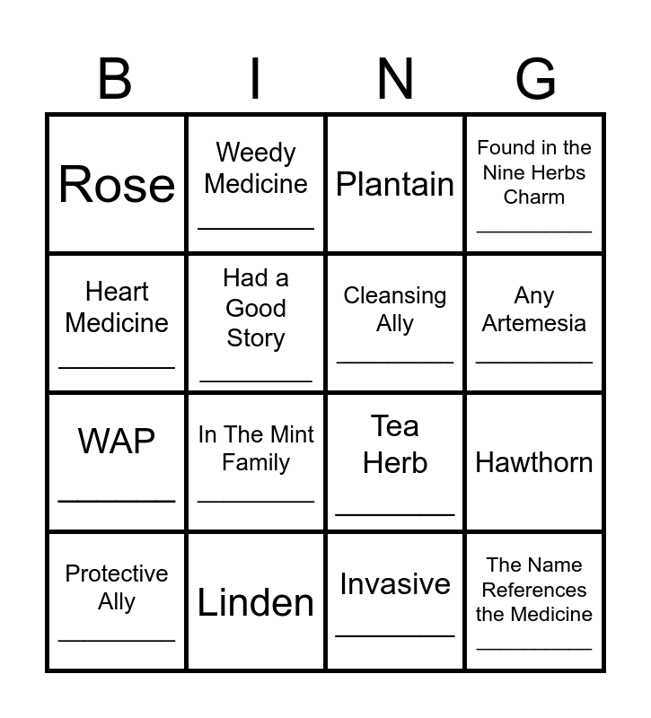 This bingo card has 16 words: Linden, Hawthorn, Plantain, Rose, WAP ______, Weedy Medicine ________, Tea Herb _______, Invasive _______, Heart Medicine ________, Had a Good Story ________, Protective Ally _________, Found in the Nine Herbs Charm __________, In The Mint Family _________, Any Artemesia _________, Cleansing Ally _________ and The Name References the Medicine __________.