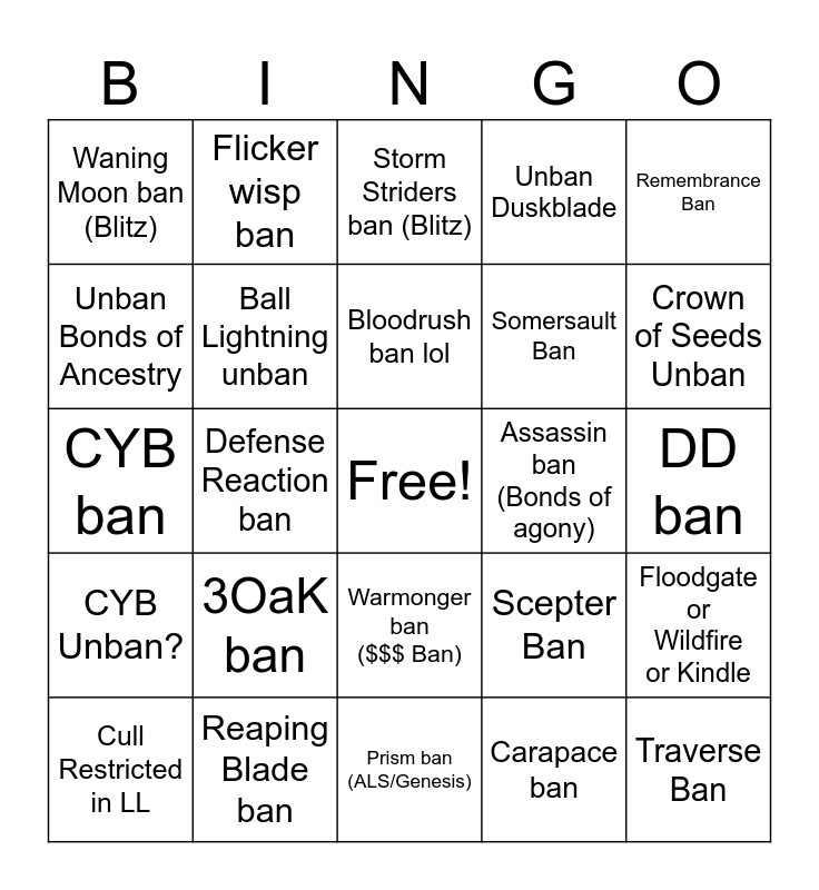 This bingo card has a free space and 24 words: 3OaK ban, Reaping Blade ban, Bloodrush ban lol, Cull Restricted in LL, Remembrance Ban, Waning Moon ban (Blitz), Unban Bonds of Ancestry, Flicker wisp ban, Assassin ban (Bonds of agony), Warmonger ban ($$$ Ban), Somersault Ban, CYB ban, Scepter Ban, Floodgate or Wildfire or Kindle, Ball Lightning unban, Carapace ban, DD ban, Storm Striders ban (Blitz), Crown of Seeds Unban, Defense Reaction ban, Traverse Ban, CYB Unban?, Unban Duskblade and Prism ban (ALS/Genesis).