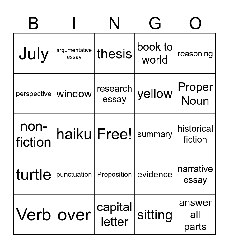 This bingo card has a free space and 49 words: restate the question, answer all parts, provide text evidence, capital letter, punctuation, smell, argumentative essay, running, perspective, biography, window, book to world, narrative essay, evidence, proof read, point of view, research essay, summary, found poetry, reasoning, haiku, sitting, July, yellow, Common Noun, Proper Noun, Verb, Adjective, Preposition, turtle, Nike, compare, contrast, sequence of events, over, description, problem and solution, fantasy, historical fiction, inferring, lead/hook, imagery, dialogue, inner thoughts, non-fiction, thesis, cause and effect, synonym and antonym.