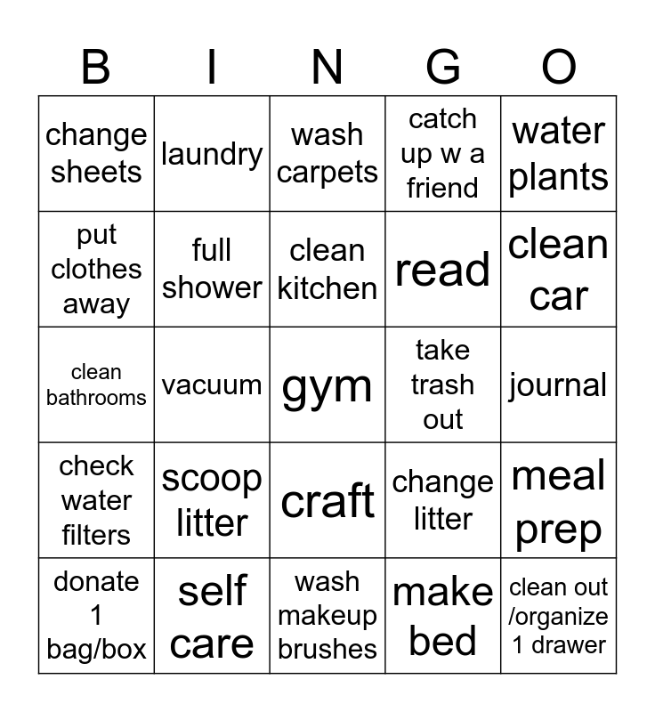 This bingo card has a free space and 24 words: scoop litter, self care, clean kitchen, donate 1 bag/box, water plants, change sheets, put clothes away, laundry, take trash out, craft, read, clean bathrooms, change litter, meal prep, full shower, make bed, journal, wash carpets, clean car, vacuum, clean out /organize 1 drawer, check water filters, catch up w a friend and wash makeup brushes.