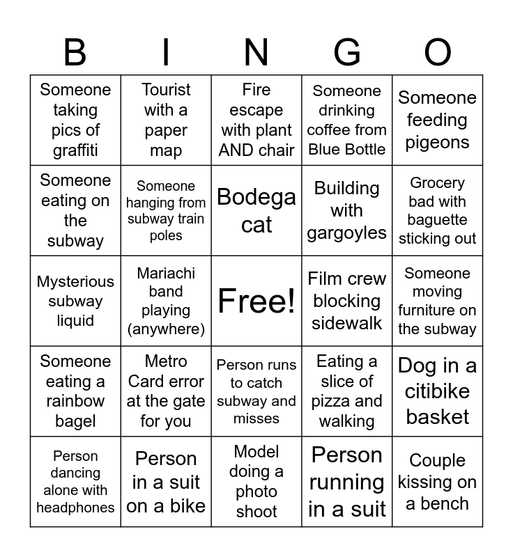 This bingo card has a free space and 28 words: Dog in a citibike basket, A stoop with 3+ people hanging out, Building with gargoyles, Person running in a suit, Someone eating on the subway, Fire escape with plant AND chair, Tourist with a paper map, Someone eating a rainbow bagel, Film crew blocking sidewalk, Person dancing alone with headphones, Mysterious subway liquid, Someone drinking coffee from Blue Bottle, Person in a suit on a bike, Model doing a photo shoot, Grocery bad with baguette sticking out, Someone walking a dog AND drinking matcha, Metro Card error at the gate for you, Someone hanging from subway train poles, Bodega cat, Person runs to catch subway and misses, Someone taking pics of graffiti, Celebrity Sighting, Couple kissing on a bench, Mariachi band playing (anywhere), Someone moving furniture on the subway, Eating a slice of pizza and walking, Someone feeding pigeons and Hot dog stand with 3+ people in line.