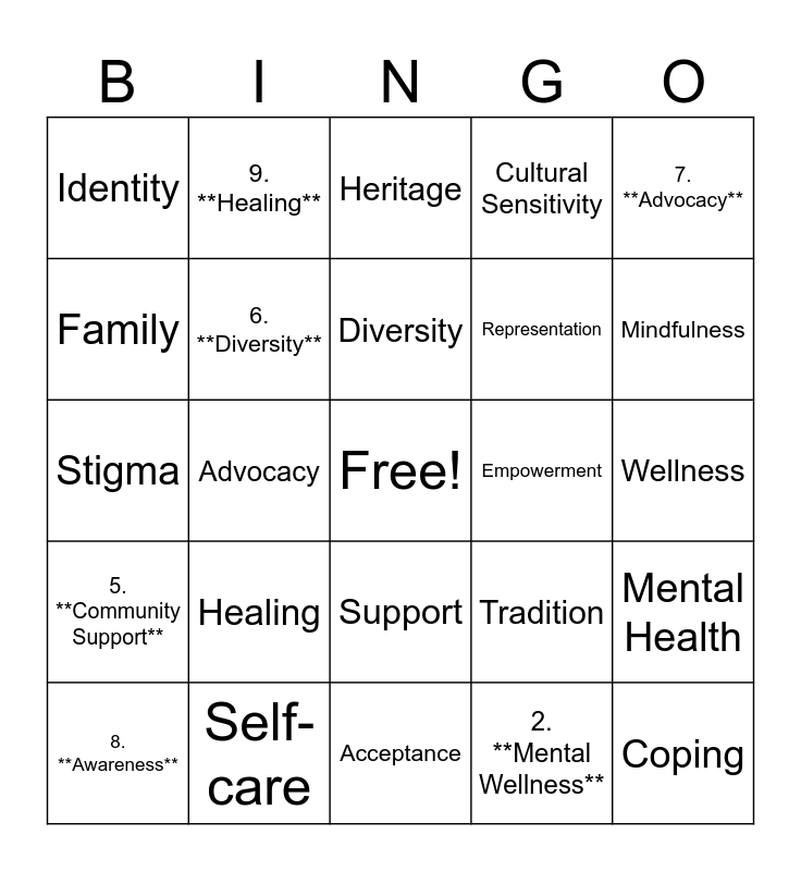 This bingo card has a free space and 34 words: Cultural Identity**, 2. **Mental Wellness**, 3. **Stigma**, 4. **Resilience**, 5. **Community Support**, 6. **Diversity**, 7. **Advocacy**, 8. **Awareness**, 9. **Healing**, 10. **Empowerment**, Diversity, Heritage, Resilience, Community, Empowerment, Mindfulness, Self-care, Stigma, Healing, Tradition, Support, Awareness, Identity, Wellness, Acceptance, Coping, Cultural Sensitivity, Intersectionality, Representation, Family, Celebration, Advocacy, Mental Health and Balance.