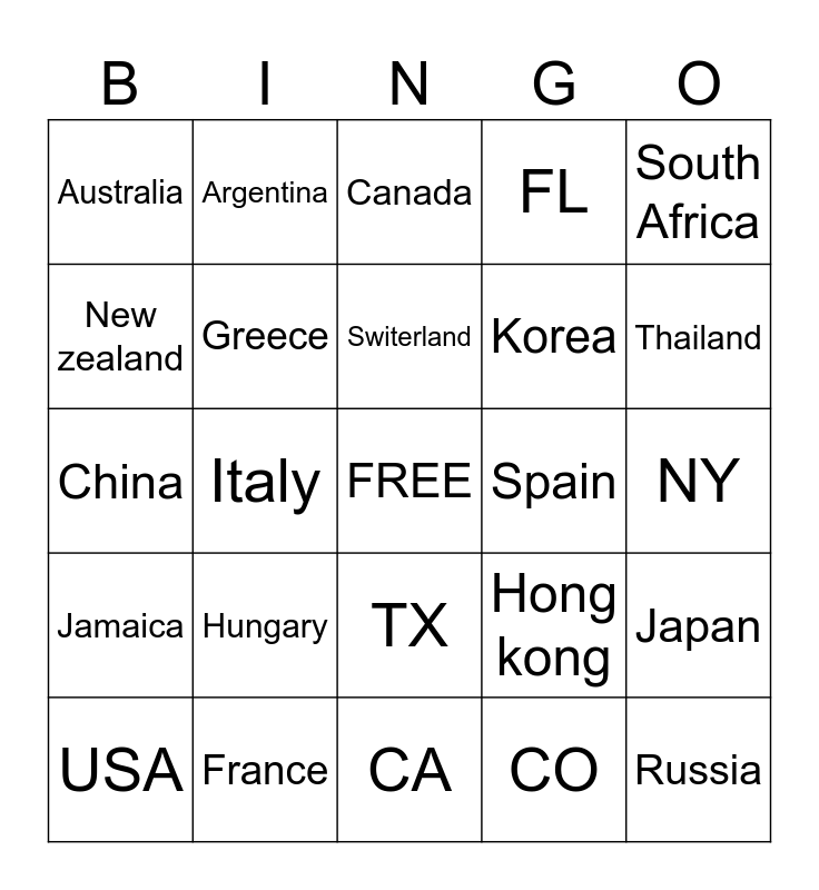 This bingo card has a free space and 24 words: Hungary, France, Switerland, USA, South Africa, Australia, New zealand, Argentina, Spain, TX, Korea, China, Hong kong, Japan, Greece, CO, NY, Canada, Thailand, Italy, Russia, Jamaica, FL and CA.