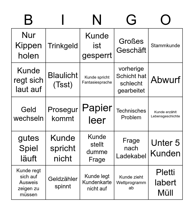 This bingo card has 25 words: Kunde spricht nicht, Kunde legt Kundenkarte nicht auf, Kunde spricht Fantasiesprache, Kunde regt sich auf Ausweis zeigen zu müssen, Stammkunde, Nur Kippen holen, Kunde regt sich laut auf, Trinkgeld, Technisches Problem, Kunde stellt dumme Frage, vorherige Schicht hat schlecht gearbeitet, Geld wechseln, Frage nach Ladekabel, Unter 5 Kunden, Blaulicht (Tsst), Pletti labert Müll, Kunde erzählt Lebensgeschichte, Kunde ist gesperrt, Abwurf, Prosegur kommt, Papier leer, Geldzähler spinnt, gutes Spiel läuft, Großes Geschäft and Kunde zieht Wettprogramm ab.