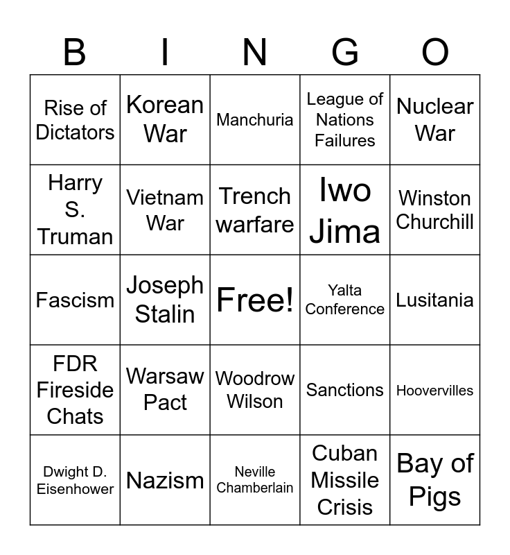 This bingo card has a free space and 91 words: Archduke Franz Ferdinand, Kaiser Wilhelm II, Woodrow Wilson, Vladimir Lenin, Militarism, Alliances, Imperialism, Nationalism, Fourteen Points, Communism, Trench Warfare, Chemical Warfare, Machine Gun, Lusitania, Zimmerman Telegram, Trench warfare, conscription, Russian Revolution, Treaty of Versailles, League of Nations, Benito Mussolini, Adolf Hitler, Neville Chamberlain, Franklin D. Roosevelt, Fascism, Nazism, Totalitarian State, Appeasement, Authoritarian, Global Depression results, Treaty of Versailles, Hoovervilles, Alphabet Soup Ideas, FDR Fireside Chats, Rise of Dictators, League of Nations Failures, Manchuria, Austria, Joseph Stalin, Winston Churchill, Dwight D. Eisenhower, Harry S. Truman, Rommel, Totalitarianism, Isolationism, Sanctions, Genocide, Stalingrad, DDAY, Battle of the Bulge, Midway, Iwo Jima, Island Hopping, Atomic Weapons, Pearl Harbor, Poland, Yalta Conference, Potsdam Conference, Japanese internment camps, Containment, Iron Curtain, Communism, John F. Kennedy, Mikhail Gorbachev, Glasnost, Perestroika, Mutually Assured Destruction, Cuban Missile Crisis, NATO, United Nations, Warsaw Pact, Bay of Pigs, Berlin Airlift, Berlin Wall, Korean War, Vietnam War, Palestine Partition, Red Scare, Domino Theory, Arms Race, Space Race, Nuclear War, Ronald Reagan, Gandhi, Decolonization, Great Leap Forward, Mao Tse-tung, A sociopolitical movement in China., Fall of Communism, Terrorism and Taliban.