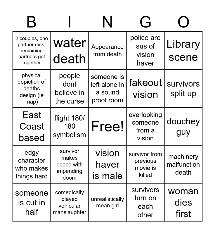 This bingo card has a free space and 29 words: someone is cut in half, “Deaths Design”, flight 180/ 180 symbolism, paranoid duct taping scene, 2 couples, one partner dies, remaining partners get together, Appearance from death, people dont believe in the curse, survivor makes peace with impending doom, overlooking someone from a vision, comedically played vehicular manslaughter, douchey guy, woman dies first, unrealistically mean girl, survivors turn on each other, survivors split up, survivor narrowly escapes death but then dies in the hospital, vision haver is male, edgy character who makes things hard, Library scene, East Coast based, survivor from previous movie is killed, fakeout “chain breaking”, fakeout vision, physical depiction of deaths design (ie map), police are sus of vision haver, water death, machinery malfunction death, someone is left alone in a sound proof room and Doctor leaves at a bad momenr.