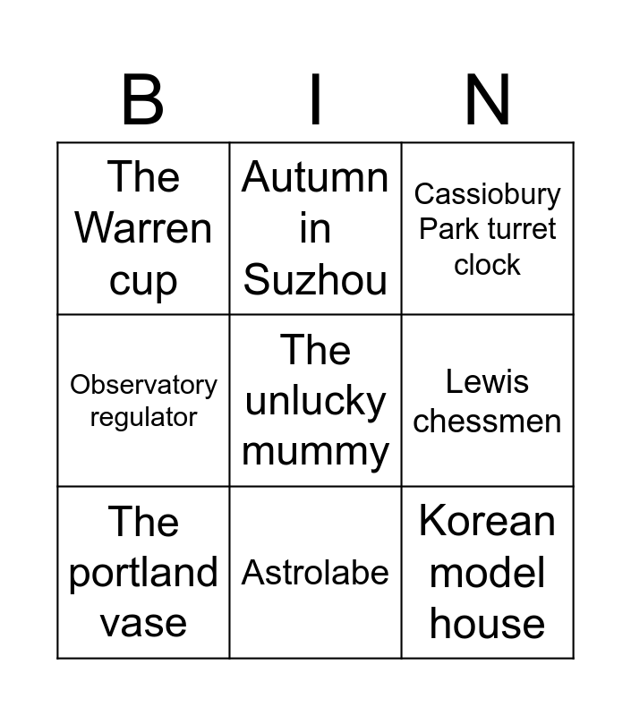 This bingo card has a free space and 8 words: Lewis chessmen, Cassiobury Park turret clock, Autumn in Suzhou, The portland vase, The Warren cup, Korean model house, Observatory regulator and Astrolabe.