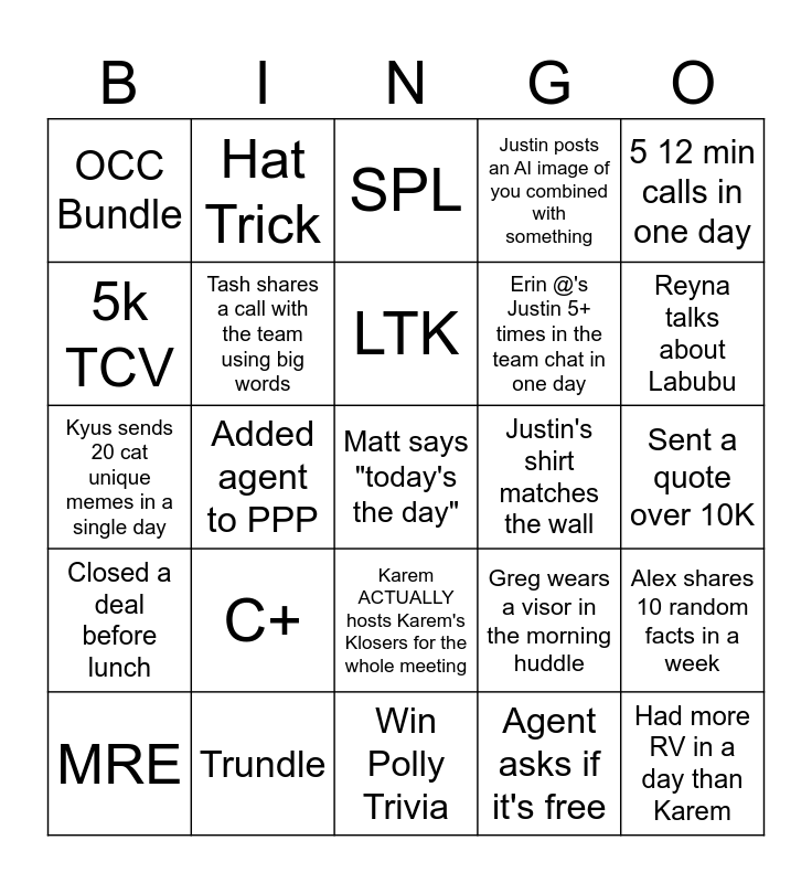 This bingo card has a free space and 24 words: C+, Trundle, LTK, MRE, 5 12 min calls in one day, OCC Bundle, 5k TCV, Hat Trick, Justin's shirt matches the wall, Karem ACTUALLY hosts Karem's Klosers for the whole meeting, Erin @'s Justin 5+ times in the team chat in one day, Kyus sends 20 cat unique memes in a single day, Greg wears a visor in the morning huddle, Alex shares 10 random facts in a week, Tash shares a call with the team using big words, Agent asks if it's free, Sent a quote over 10K, SPL, Reyna talks about Labubu, Added agent to PPP, Had more RV in a day than Karem, Closed a deal before lunch, Justin posts an AI image of you combined with something and Win Polly Trivia.