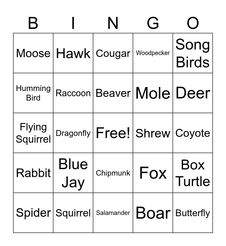 This bingo card has a free space and 42 words: Ant, Beaver, Bear, Blue Jay, Boar, Box Turtle, Butterfly, Cardinal, Cougar, Chipmunk, Coyote, Deer, Dragonfly, Song Birds, Elk, Fox, Frog, Flying Squirrel, Ground Hog, Hawk, Humming Bird, Hare, Marten, Moose, Mosquito, Mouse, Mole, Lynx, Owl, Opossum, Porcupine, Rabbit, Raccoon, Salamander, Skunk, Spider, Squirrel, Shrew, Turkey, Wolf, Woodpecker and Weasel.