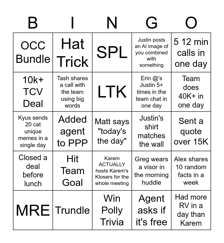 This bingo card has a free space and 24 words: Hit Team Goal, Trundle, LTK, MRE, 5 12 min calls in one day, OCC Bundle, 10k+ TCV Deal, Hat Trick, Justin's shirt matches the wall, Karem ACTUALLY hosts Karem's Klosers for the whole meeting, Erin @'s Justin 5+ times in the team chat in one day, Kyus sends 20 cat unique memes in a single day, Greg wears a visor in the morning huddle, Alex shares 10 random facts in a week, Tash shares a call with the team using big words, Agent asks if it's free, Sent a quote over 15K, SPL, Team does 40K+ in one day, Added agent to PPP, Had more RV in a day than Karem, Closed a deal before lunch, Justin posts an AI image of you combined with something and Win Polly Trivia.