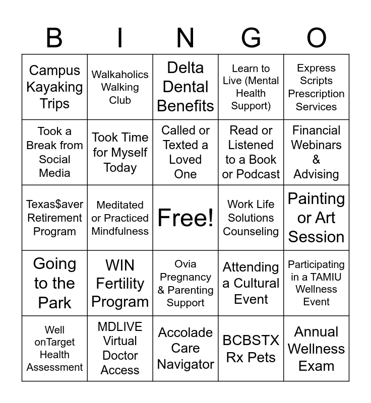 This bingo card has a free space and 43 words: Two-Step Wellness Program (WebMD ONE), Annual Wellness Exam, WebMD ONE Account Access, Well onTarget Health Assessment, BCBSTX Fitness Program, BCBSTX Rx Pets, Delta Dental Benefits, Superior Vision Coverage, Express Scripts Prescription Services, MDLIVE Virtual Doctor Access, Learn to Live (Mental Health Support), Work Life Solutions Counseling, Ovia Pregnancy & Parenting Support, WIN Fertility Program, 2nd.MD Medical Opinion Service, Accolade Care Navigator, Identity Protection Services, Texas$aver Retirement Program, Optional Retirement Plans (TDA/DCP), Financial Webinars & Advising, Walkaholics Walking Club, Rec Center Fitness Classes, Rec Center 2-Week Pass, Campus Kayaking Trips, Gardening (at home or in community), Painting or Art Session, Family Movie Night at TAMIU, Lunch & Learns, Attending a Cultural Event, Going to the Park, Volunteering with VITA, Participating in a TAMIU Wellness Event, Tried a New Healthy Recipe, Meditated or Practiced Mindfulness, Got 7–8 Hours of Sleep, Took a Walk During Lunch, Drank Water All Day, Called or Texted a Loved One, Took a Break from Social Media, Read or Listened to a Book or Podcast, Enjoyed a Hobby, Took Time for Myself Today and Flu Vaccine at Student Health.