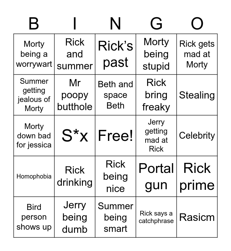 This bingo card has a free space and 24 words: Rick drinking, Jerry being dumb, Beth and space Beth, Bird person shows up, Rick gets mad at Morty, Morty being a worrywart, Summer getting jealous of Morty, Rick and summer, Jerry getting mad at Rick, Rick being nice, Rick bring freaky, Morty down bad for jessica, Portal gun, Rick prime, Mr poopy butthole, Rick says a catchphrase, Celebrity, Rick’s past, Stealing, S*x, Rasicm, Homophobia, Morty being stupid and Summer being smart.