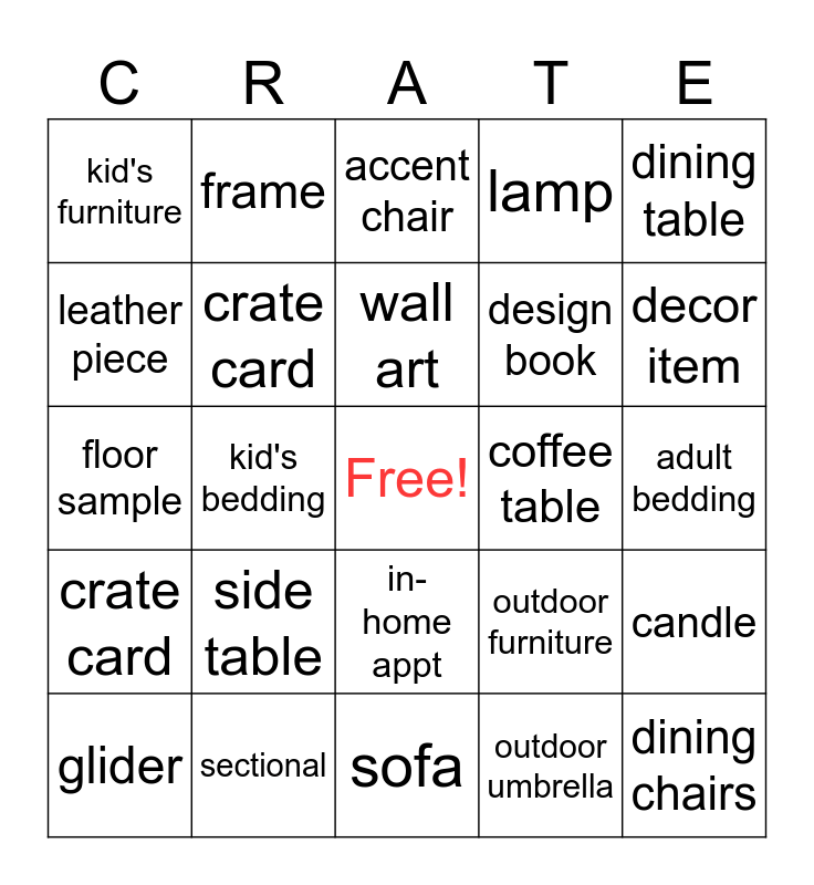 This bingo card has a free space and 24 words: side table, sectional, wall art, glider, dining table, kid's furniture, leather piece, frame, coffee table, in-home appt, design book, floor sample, outdoor furniture, candle, crate card, outdoor umbrella, adult bedding, accent chair, decor item, kid's bedding, dining chairs, crate card, lamp and sofa.