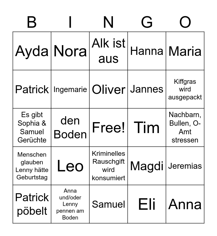 This bingo card has a free space and 49 words: Sophia, Anna, Lenny, Samuel, Leo, Greta, Nora, Johnny, Patrick, Michelle, Ingemarie, Hanna, Jeremias, Magdi, Mia, Nina, Oliver, Tim, Wanofi, Maria, den Boden, Eli, Ayda, Jannes, Jakob, Kiffgras wird ausgepackt, Patrick pöbelt, Lennys Zimmer wird ausgeräuchert, Kriminelles Rauschgift wird konsumiert, Menschen glauben Lenny hätte Geburtstag, Lenny bekommt Geschenke, Sophia holt sich einen auf die Pfannkuchentorte runter, Randos kommen, Lenny tanzt nackt in der Küche, Anna und/oder Lenny pennen am Boden, 2+ Personen machen kotzi kotzi, Friseurstudio wird eröffnet, Das Bad wird zweckentfremdet, Nachbarn, Bullen, O-Amt stressen, Gläser sind alle, Irgendwas geht kaputt, Jemand übt auf der Treppe fliegen, Im Keller wird jemand vergenussferkelt, Sicherung fliegt, Es gibt Sophia & Samuel Gerüchte, Alk ist aus, Irgendwer fliegt raus, Es gibt Stress und Krawalle and Irgendwer wird entführt um die Familie zu erpressen.