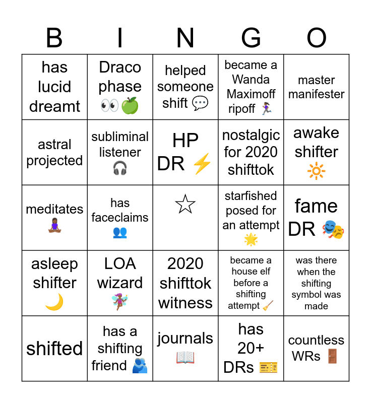 This bingo card has a free space and 24 words: LOA wizard ๐ง๐พโโ๏ธ, has a shifting friend ๐ซ, HP DR โก, shifted, master manifester, has lucid dreamt, astral projected, Draco phase ๐๐, starfished posed for an attempt ๐, 2020 shifttok witness, nostalgic for 2020 shifttok, meditates ๐ง๐พโโ๏ธ, became a house elf before a shifting attempt ๐งน, was there when the shifting symbol was made, subliminal listener ๐ง, has 20+ DRs ๐ซ, fame DR ๐ญ, helped someone shift ๐ฌ, awake shifter ๐, has faceclaims ๐ฅ, countless WRs ๐ช, asleep shifter ๐, became a Wanda Maximoff ripoff ๐๐พโโ๏ธ and journals ๐.