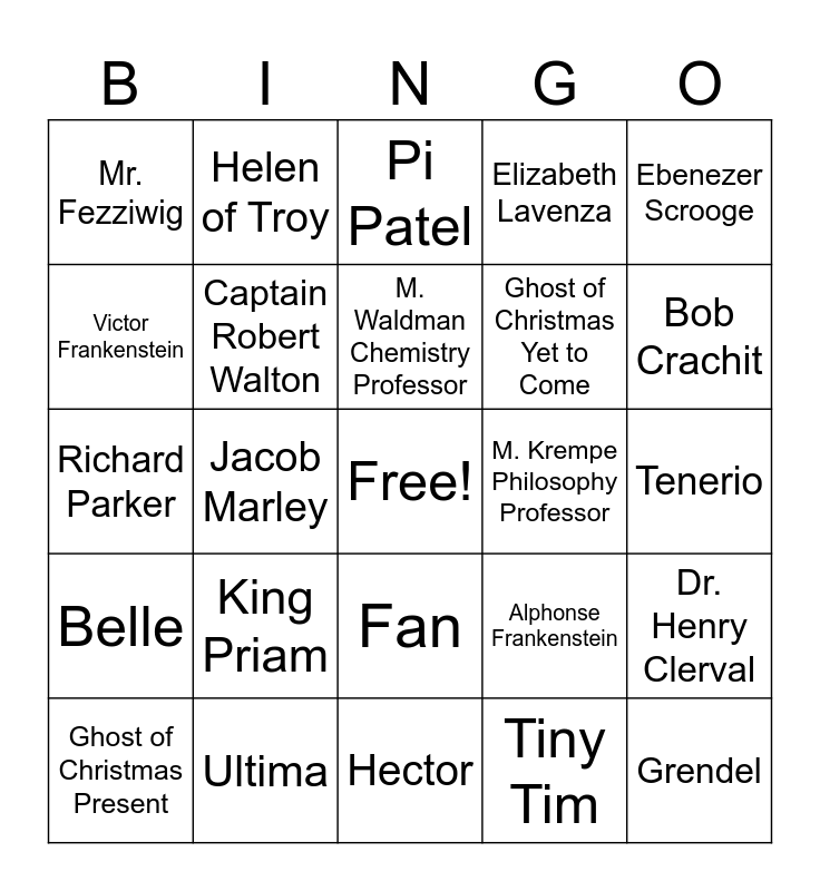 This bingo card has a free space and 47 words: Beowulf, Grendel, Achilles, Hector, King Priam, Paris, Helen of Troy, Mary Shelley, Victor Frankenstein, Frankenstein’s Monster, Captain Robert Walton, Elizabeth Lavenza, Dr. Henry Clerval, Alphonse Frankenstein, William Frankenstein, Justin Moritz, M. Waldman Chemistry Professor, M. Krempe Philosophy Professor, The Peasants, Ebenezer Scrooge, Jacob Marley, Tiny Tim, Mr. Fezziwig, Ghost of Christmas Yet to Come, Ghost of Christmas Past, Bob Crachit, Ghost of Christmas Present, Fred, Fan, Belle, Martha Crachit, Emily Crachit, Charles Dickens, Rudolfo Anaya, Tony Marez, Ultima, Tenerio, Gabriel Marez, Narcisco, The Gang, Yann Martel, Pi Patel, Richard Parker, The Author, Mamaji, The Zebra, Hyena, Orangutan and Mr. Tomohiro Okamoto and Mr. Atsuro.