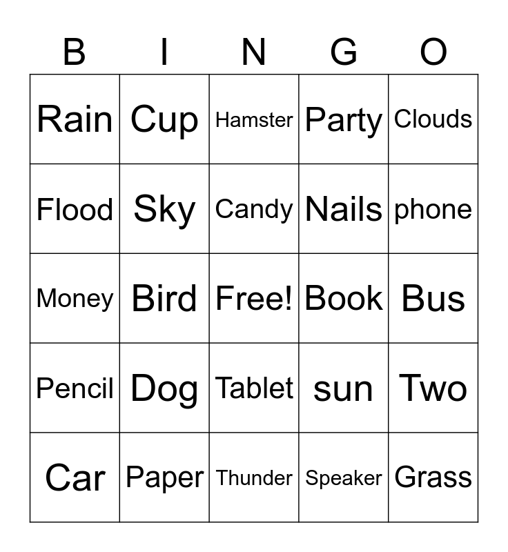 This bingo card has a free space and 24 words: Dog, Paper, Candy, Car, Clouds, Rain, Flood, Cup, Book, Tablet, Nails, Money, sun, Two, Sky, Speaker, Bus, Hamster, phone, Bird, Grass, Pencil, Party and Thunder.