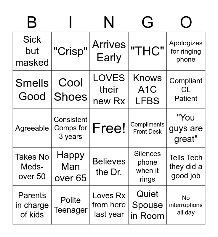 This bingo card has a free space and 24 words: Happy Man over 65, Polite Teenager, LOVES their new Rx, Parents in charge of kids, Apologizes for ringing phone, Sick but masked, Smells Good, "Crisp", Compliments Front Desk, Believes the Dr., Knows A1C LFBS, Agreeable, Silences phone when it rings, Tells Tech they did a good job, Cool Shoes, Quiet Spouse in Room, "You guys are great", Arrives Early, Compliant CL Patient, Consistent Comps for 3 years, No interruptions all day, Takes No Meds- over 50, "THC" and Loves Rx from here last year.