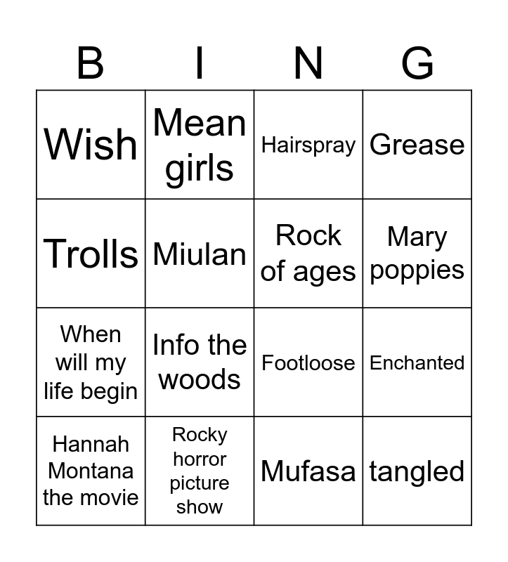 This bingo card has 30 words: Mamma Mia, Wicked, Enchanted, Mamma Mia 2, Wish, Hairspray, Rock of ages, Hercules, Rocky horror picture show, Pitch perfect, Mufasa, Hannah Montana the movie, Annie, High School musical, Info the woods, The greatest showman, Burlesque, tangled, Rent, Trolls, Footloose, Ella enchanted, Mean girls, When will my life begin, Miulan, Grease, Frozen, the aristocats, Mary poppies and Lizzie McGuire the movie.