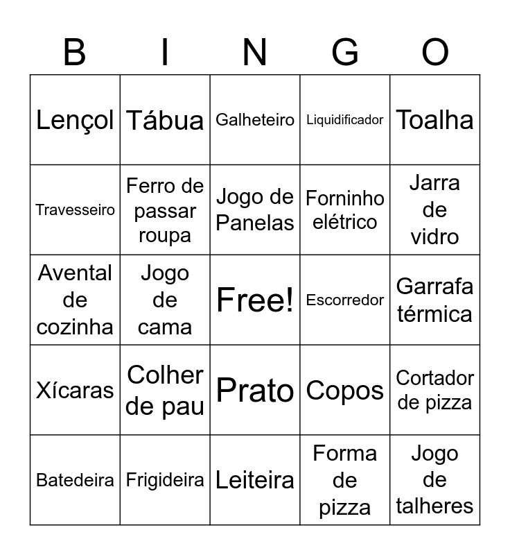 This bingo card has a free space and 24 words: Colher de pau, Frigideira, Jogo de Panelas, Batedeira, Toalha, Lençol, Travesseiro, Tábua, Escorredor, Prato, Forninho elétrico, Avental de cozinha, Copos, Cortador de pizza, Ferro de passar roupa, Forma de pizza, Garrafa térmica, Galheteiro, Jarra de vidro, Jogo de cama, Jogo de talheres, Xícaras, Liquidificador and Leiteira.