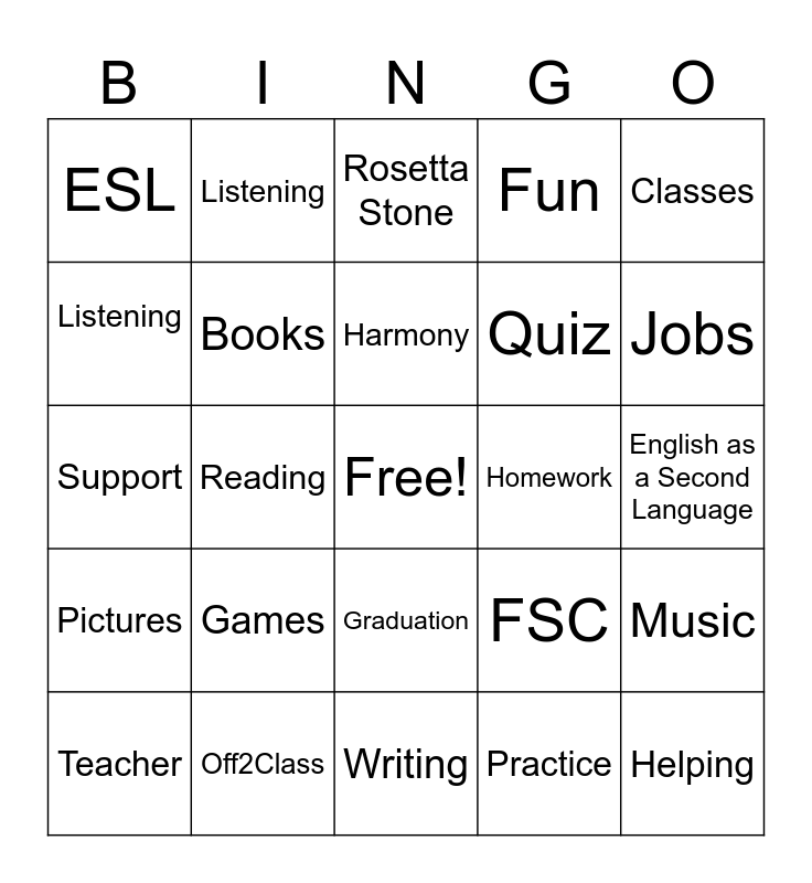 This bingo card has a free space and 29 words: Teacher, Classmates, Reading, Attendance, ESL, Rosetta Stone, Books, Games, Homework, Off2Class, English as a Second Language, Helping, Writing, Practice, Jobs, Study, Graduation, Pictures, Classes, Support, FSC, UFL Hours, Quiz, Listening, Fun, Listening, Music, Harmony and English.