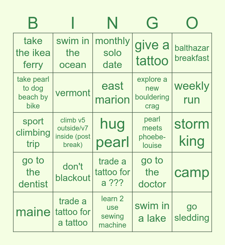 This bingo card has a free space and 24 words: don't blackout, trade a tattoo for a tattoo, east marion, maine, balthazar breakfast, take the ikea ferry, take pearl to dog beach by bike, swim in the ocean, pearl meets phoebe-louise, trade a tattoo for a ???, explore a new bouldering crag, sport climbing trip, go to the doctor, camp, vermont, swim in a lake, storm king, monthly solo date, weekly run, climb v5 outside/v7 inside (post break), go sledding, go to the dentist, give a tattoo and learn 2 use sewing machine.