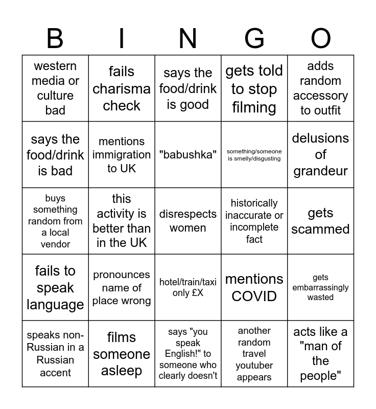 This bingo card has a free space and 24 words: pronounces name of place wrong, films someone asleep, "babushka", speaks non-Russian in a Russian accent, adds random accessory to outfit, western media or culture bad, says the food/drink is bad, fails charisma check, historically inaccurate or incomplete fact, hotel/train/taxi only £X, something/someone is smelly/disgusting, buys something random from a local vendor, mentions COVID, gets embarrassingly wasted, mentions immigration to UK, another random travel youtuber appears, gets scammed, says the food/drink is good, delusions of grandeur, this activity is better than in the UK, acts like a "man of the people", fails to speak language, gets told to stop filming and says "you speak English!" to someone who clearly doesn't.