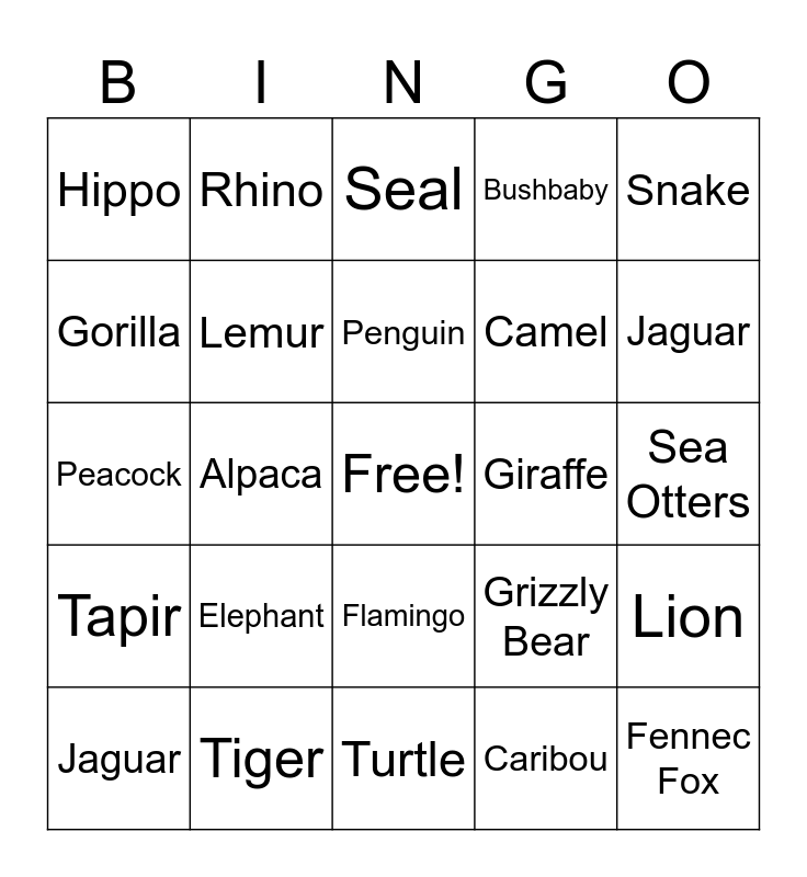 This bingo card has a free space and 24 words: Elephant, Tiger, Penguin, Jaguar, Snake, Hippo, Gorilla, Rhino, Giraffe, Flamingo, Camel, Peacock, Grizzly Bear, Lion, Lemur, Caribou, Sea Otters, Seal, Jaguar, Alpaca, Fennec Fox, Tapir, Bushbaby and Turtle.
