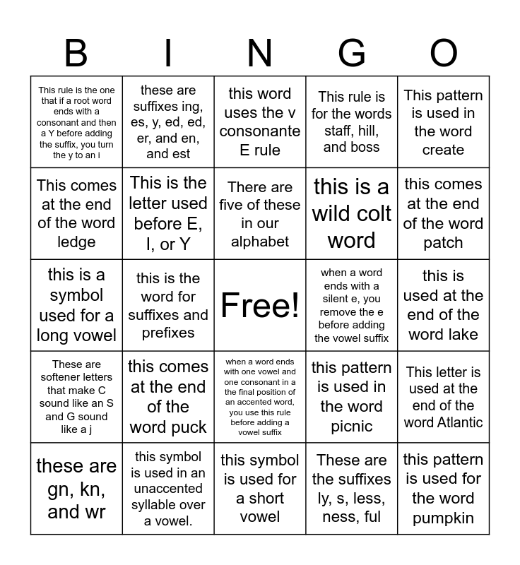 This bingo card has a free space and 24 words: this comes at the end of the word puck, this symbol is used in an unaccented syllable over a vowel., There are five of these in our alphabet, these are gn, kn, and wr, This pattern is used in the word create, This rule is the one that if a root word ends with a consonant and then a Y before adding the suffix, you turn the y to an i, This comes at the end of the word ledge, these are suffixes ing, es, y, ed, ed, er, and en, and est, when a word ends with a silent e, you remove the e before adding the vowel suffix, when a word ends with one vowel and one consonant in a the final position of an accented word, you use this rule before adding a vowel suffix, this is a wild colt word, this is a symbol used for a long vowel, this pattern is used in the word picnic, This letter is used at the end of the word Atlantic, This is the letter used before E, I, or Y, These are the suffixes ly, s, less, ness, ful, this is used at the end of the word lake, this word uses the v consonante E rule, this comes at the end of the word patch, this is the word for suffixes and prefixes, this pattern is used for the word pumpkin, These are softener letters that make C sound like an S and G sound like a j, This rule is for the words staff, hill, and boss and this symbol is used for a short vowel.