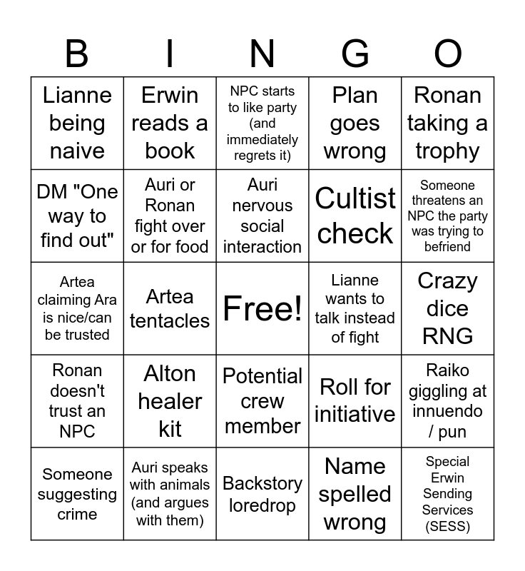 This bingo card has a free space and 52 words: Ronan almost starts a fight, Special Erwin Sending Services (SESS), Cat joke about Artea, Backstory loredrop, Alton healer kit, Ronan gets scolded, Erwin reads a book, Artea finds a use for paper, DM "One way to find out", Alton 25+ sleight of hand, Auri or Ronan fight over or for food, Auri makes a mean comment, Raiko giggling at innuendo / pun, Roll for initiative, Alton shady joke, Deploying animals out of combat, Auri nervous social interaction, Lianne wants to talk instead of fight, Party name drop, Ronan taking a trophy, Artea tentacles, Name spelled wrong, Lianne being naive, Cultist check, Worldbuilding loredrop, Erwin deception check, Nat 1, Nat 20, Someone threatens an NPC the party was trying to befriend, Artea casually drops dark lore mid conversation, Party got split, Plan goes wrong, Going in with no plan, Auri causes chaos while Wildshaped, Not following plans, NPC starts to like party (and immediately regrets it), Auri speaks with animals (and argues with them), Artea blindly trusting Ara, Lianne being our moral compass, Alton meets a horse, Artea flashes book, Crazy dice RNG, Ronan doesn't trust an NPC, Door boss, Potential crew member, Romantic moment wasted, DM "You can certainly try", Artea claiming Ara is nice/can be trusted, "oh no they're hot", Lianne party mom / oneesan moment, Someone suggesting crime and Someone from the party gets really drunk.