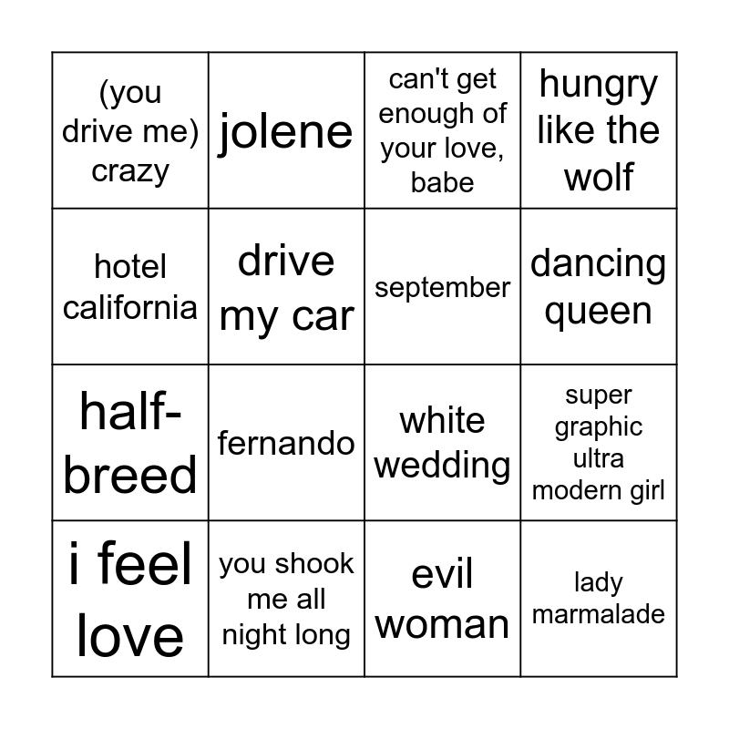 This bingo card has 30 words: a hard day's night, revolution, super graphic ultra modern girl, you're so vain, (you drive me) crazy, can't get enough of your love, babe, september, american pie, you shook me all night long, the distance, evil woman, i feel love, old time rock and roll, walk this way, fernando, brick house, (don't fear) the reaper, lady marmalade, we didn't start the fire, hotel california, white wedding, put some sugar on me, jolene, half-breed, drive my car, hungry like the wolf, thunderstruck, ...baby one more time, dancing queen and complicated.
