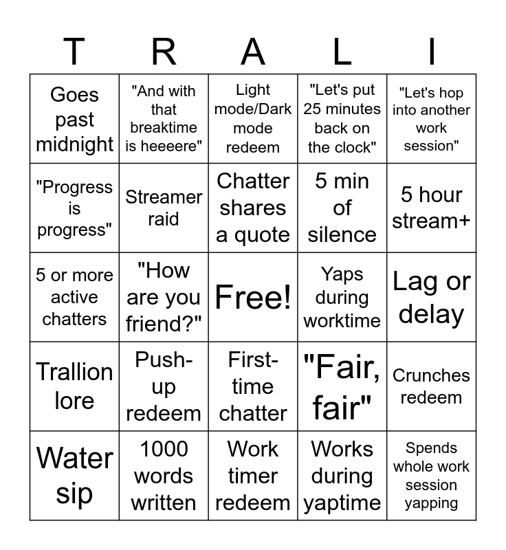 This bingo card has a free space and 24 words: Water sip, Push-up redeem, Chatter shares a quote, Works during yaptime, "Let's hop into another work session", Goes past midnight, "And with that breaktime is heeeere", Light mode/Dark mode redeem, Yaps during worktime, Lag or delay, 5 or more active chatters, Streamer raid, "Fair, fair", Crunches redeem, "Progress is progress", 1000 words written, Work timer redeem, "Let's put 25 minutes back on the clock", 5 hour stream+, Trallion lore, "How are you friend?", First-time chatter, 5 min of silence and Spends whole work session yapping.