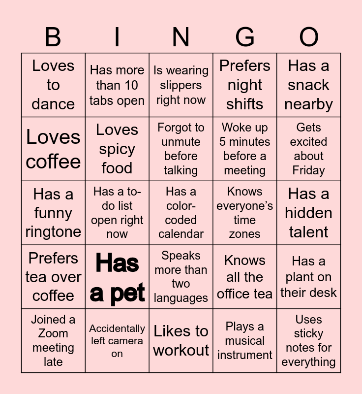 This bingo card has 25 words: Has a pet, Likes to workout, Forgot to unmute before talking, Joined a Zoom meeting late, Has a snack nearby, Loves to dance, Loves coffee, Has more than 10 tabs open, Knows everyone’s time zones, Speaks more than two languages, Woke up 5 minutes before a meeting, Has a funny ringtone, Knows all the office tea, Has a plant on their desk, Loves spicy food, Uses sticky notes for everything, Has a hidden talent, Is wearing slippers right now, Gets excited about Friday, Has a to-do list open right now, Has a color-coded calendar, Accidentally left camera on, Prefers tea over coffee, Prefers night shifts and Plays a musical instrument.