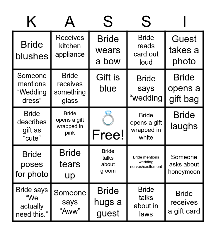 This bingo card has a free space and 24 words: Bride tears up, Someone says “Aww”, Gift is blue, Bride says “We actually need this.”, Guest takes a photo, Bride blushes, Someone mentions “Wedding dress”, Receives kitchen appliance, Bride opens a gift wrapped in white, Bride talks about groom, Bride says “wedding, Bride describes gift as “cute”, Bride mentions wedding nerves/excitement, Someone asks about honeymoon, Bride receives something glass, Bride talks about in laws, Bride laughs, Bride wears a bow, Bride opens a gift bag, Bride opens a gift wrapped in pink, Bride receives a gift card, Bride poses for photo, Bride reads card out loud and Bride hugs a guest.