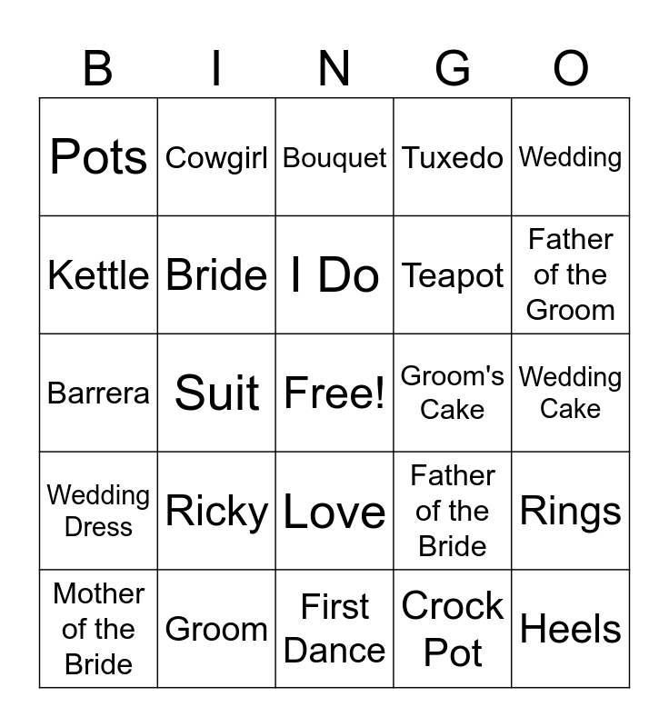 This bingo card has a free space and 40 words: Amor, Barrera, Perusquia, Bride, Groom, Love, I Do, Vows, Wedding, Wedding Dress, Suit, Tuxedo, Heels, Wedding Cake, Groom's Cake, Ricky, Toaster, Pots, Pans, Bouquet, Rings, Crock Pot, Teapot, Kettle, Ring Bearer, Flower Girl, Best Man, Groom's Man, Bridesmaid, Maid of Honor, Matron of Honor, Mother of the Bride, Mother of the Groom, Father of the Bride, Father of the Groom, First Dance, Boots, Hat, Cowgirl and Last Rodeo.